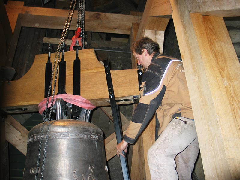 Nachdem nun in der letzten Woche der Glockenstuhl fertig errichtet wurde, konnte nun die Fa. Willing die Glocken hoch ziehen in ihre Positionen im Glockenstuhl. Außerdem wurden sie mit Klöppel und Läutewerk vervollständigt. Diese tonnenschweren liturgischen Musikinstrumente sollen ja nun länger als ihre Vorgänger aus Eisenhartguss ihren Dienst verrichten.